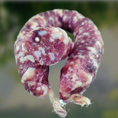 Die Ringsalami wird 8 Wochen luftgetrocknet und mit ganzen Pfefferkörnern gewürzt, das gibt ein herrlich pfeffriges Aroma.